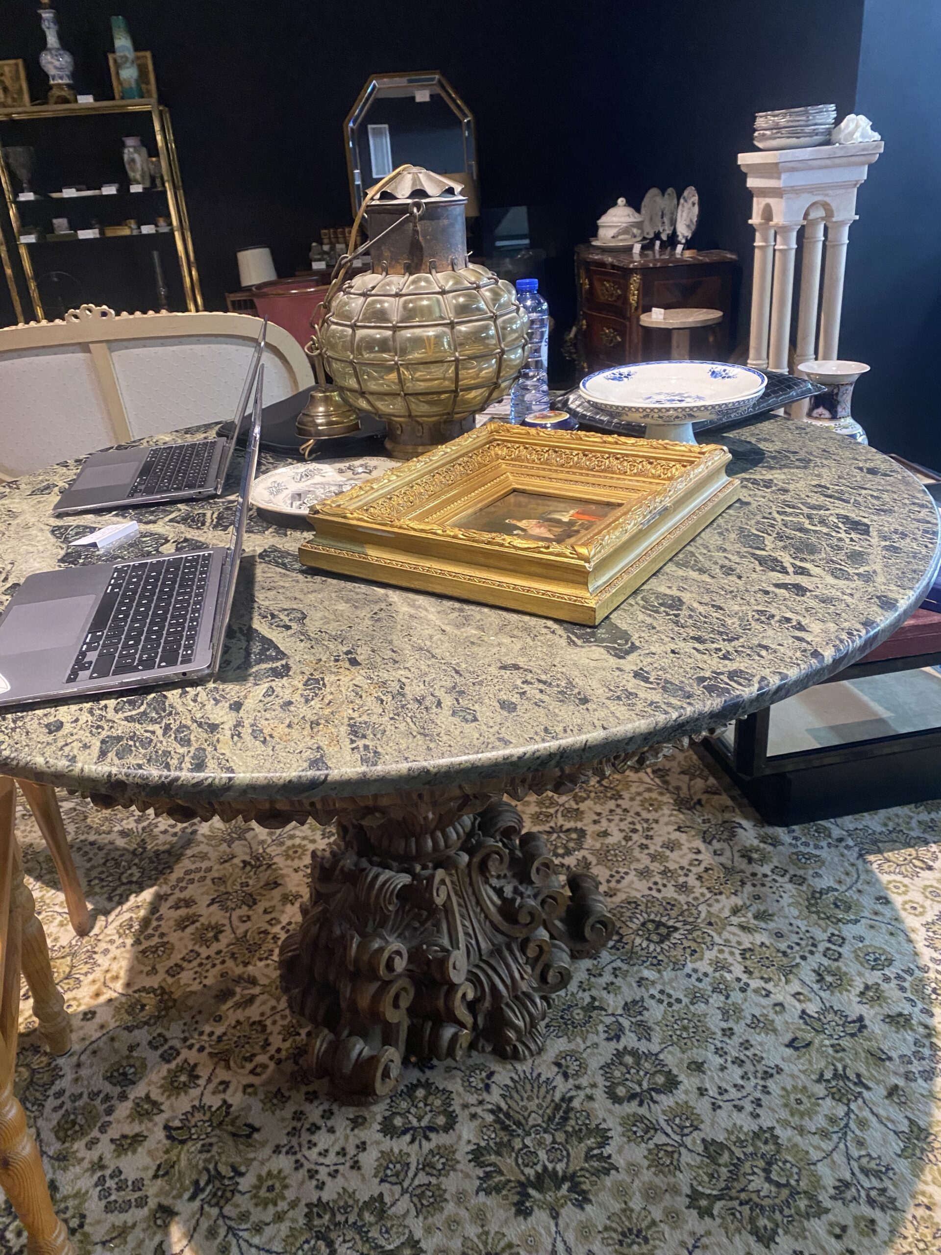 Table ronde de salle à manger bois sculpté, tablette marbre style baroque italien XXe
